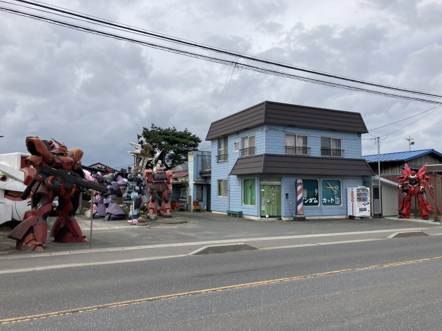 這是一家坐落於青森縣上北郡おいらせ町的理髮店,店面看起來沒什麼問題,比較引人注目的是周圍的鋼彈們,有初鋼、夏亞專用薩克、德姆、新安洲等熟悉的機體,而且還是正常人大小的版本,這些機體就這樣一個個遍布於理髮店附近,另外理髮店隔壁還有一顆大大的初鋼頭,那不是什麼初鋼殘骸而是卡拉OK廳。光是從遠處看可能都會覺得「這是聯邦還是吉翁開設的基地嗎?」