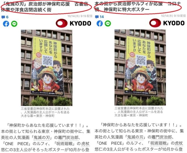 而日本就有眼尖的網友發現了這篇新聞的標題有被改過的痕跡,原本的標題為「《鬼滅之刃》的炭治郎為神保町應援 舊書店停業和洋食館持續閉店的街道」更改成為了「炭治郎和魯夫為書的街道應援 受到肺炎影響,神保町出現特大海報」。