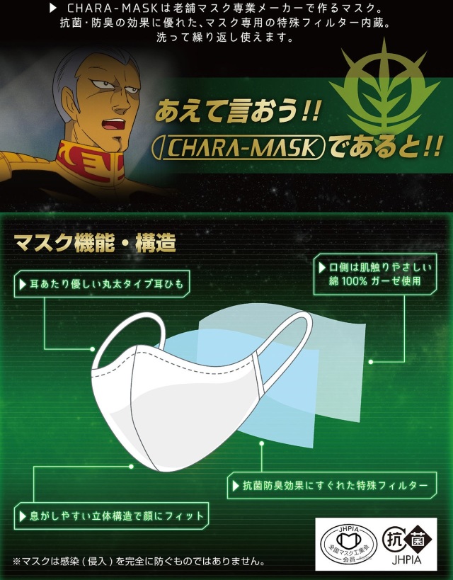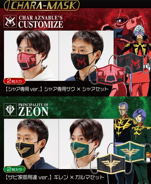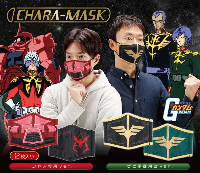 萬代旗下製作動漫 IP 口罩的系列「CHARA-MASK(キャラマスク)」,先前製作過「星之卡比口罩」,這次選擇《機動戰士鋼彈》製作,以夏亞專用與吉翁軍政治世家-薩比家為主題,設計共四款口罩。售價為 1,650 日圓,預計於 2021 年 2 月出貨。