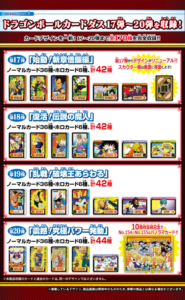 還記得 80~90 年代風靡一時的萬代玩具集換式卡片品牌「Carddass」嗎?之前因應《七龍珠超 布羅利》劇場版上映將推出其「卡牌COMPLETE BOX」set盒裝組合。最近將推出《七龍珠卡牌 Carddass 》Premium set Vol.5,包含 170 張卡片一次收錄,多為《七龍珠 Z》時期的劇情卡片,為過去 17~20 彈的卡牌。經典的閃卡也完美復刻,想必讓許多七龍珠粉絲相當懷念,想要收藏童年回憶的這次機會難得阿~~~