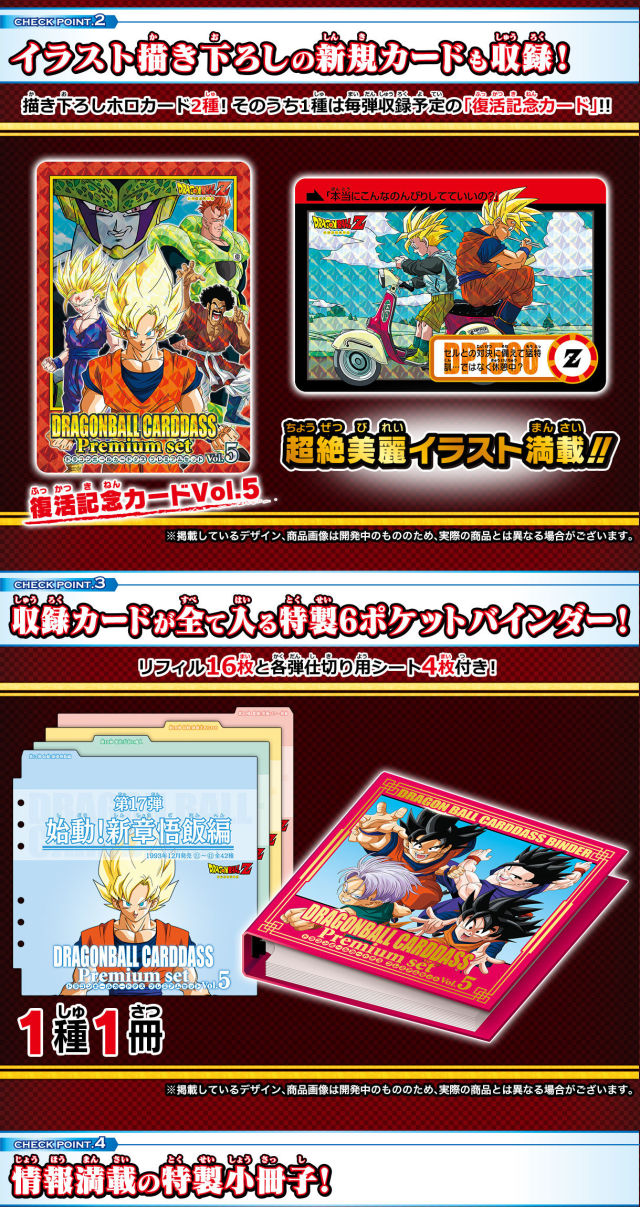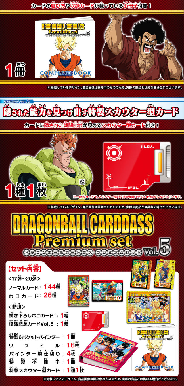 《七龍珠卡牌 Carddass 》Premium set Vol.5 還附贈特製 6 裝收納活頁夾( 特製6ポケットバインダー,附 4 張特製分頁夾 ) 能輕鬆的收納這次的卡牌,還有特製的小冊子,更有過去沒有的一張「史考特卡片」,一次滿足懷舊粉的慾望。