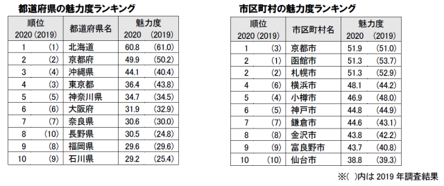 相信大家對於日本的喜愛都不在話下,雖然今年因為武漢肺炎的關係,除了工作上的需求想必許多人都對於無法前往日本旅遊非常扼腕。對於日本各地或是都市,大家喜好的程度或許也有些許不同。最近由日本品牌總合研究所 ( 株式会社ブランド総合研究所) 公布的調查,日本最有吸引力的行政區 - 都道府縣&市區町村的數據,最有吸引力的縣為蟬連十二年冠軍的北海道;而市為京都市,擊敗了去年的冠軍函館市。