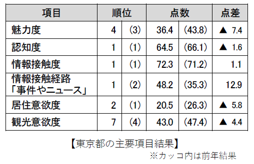 但其中以東京都來看,整體數值都是下降的。 不但在吸引力、觀光動機及居住意願上都下滑,可以發現東京除了在資訊流通上居於第一外,其他部分在日本人心中的地位都不若過往。