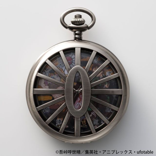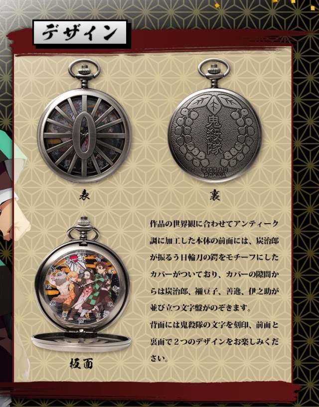 現在在日本,幾乎是到處都看得到鬼滅之刃的相關商品,連日本連鎖商店LAWSON 都有合作的期間限定主題店。這次萬代推出的懷錶,以日輪刀的刀柄做為懷錶錶蓋設計,打開之後錶面是鬼滅之刃四位主角的圖片,數字的部分也改以使用漢字表現。錶的背面則是刻上鬼殺隊的字樣,細節不少。雖然懷錶對一般人來說比較沒有使用的習慣,不過懷錶現在象徵的是一個時尚或復古的情懷,其實多數人把他當作飾品,算是一個復古 Style。