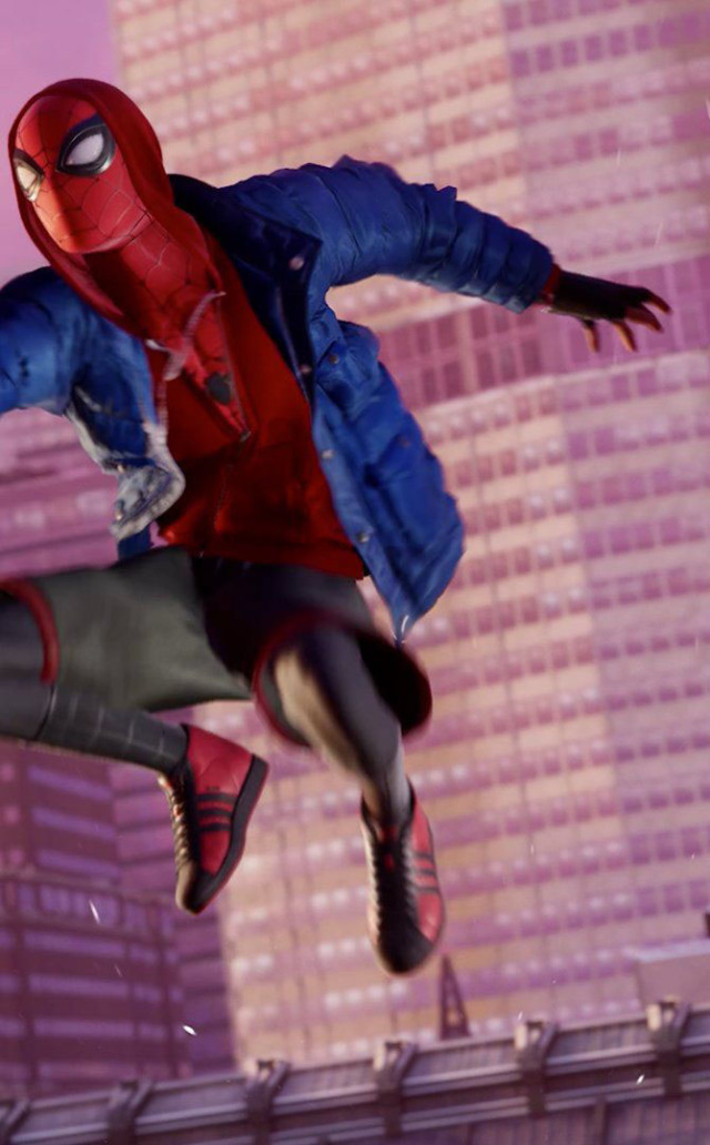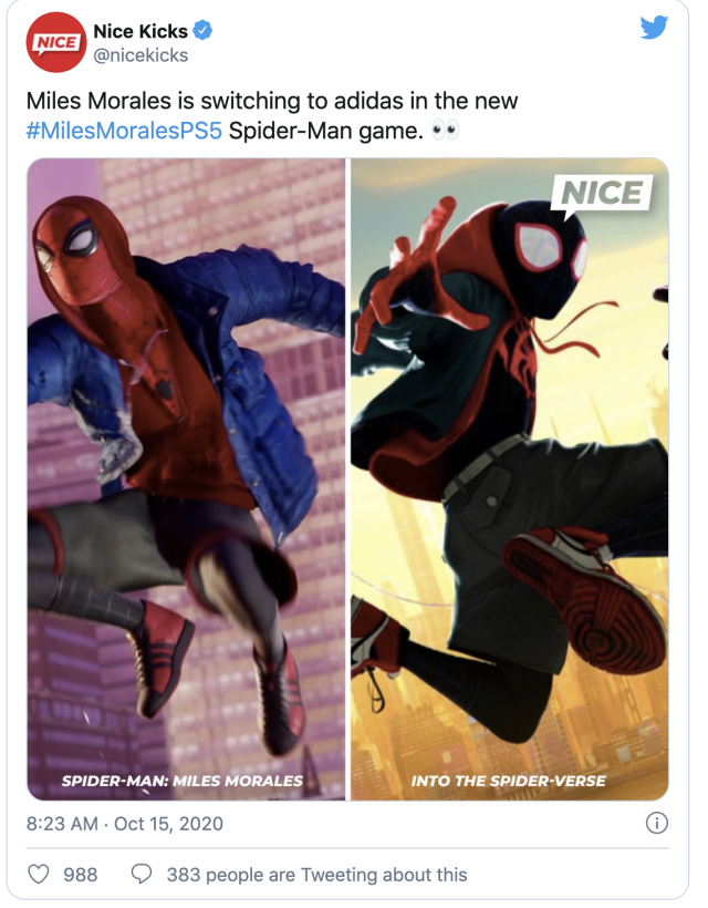 球鞋網站Nice Kicks放上了兩張圖片,並指出其中的差異。在《蜘蛛人:新宇宙》中邁爾斯·莫拉雷斯穿的球鞋是大名鼎鼎的喬丹一代。但是,在遊戲《蜘蛛人:邁爾斯·莫拉雷斯》中,他則是穿著一雙愛迪達的球鞋。
