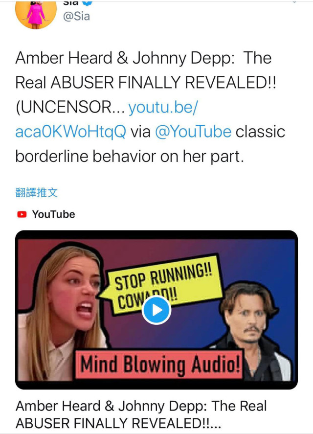 澳洲女歌手希雅(Sia)在個人推特上發布了數則推文,表態支持強尼戴普(Johnny Depp)。到目前為止,戴普和前妻安柏赫德(Amber Heard)的官司仍在如火如荼的展開中。