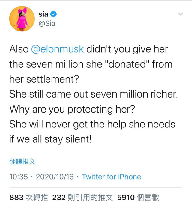 新聞來源:Sia推特