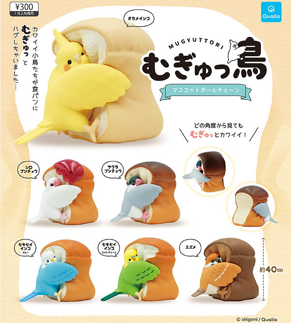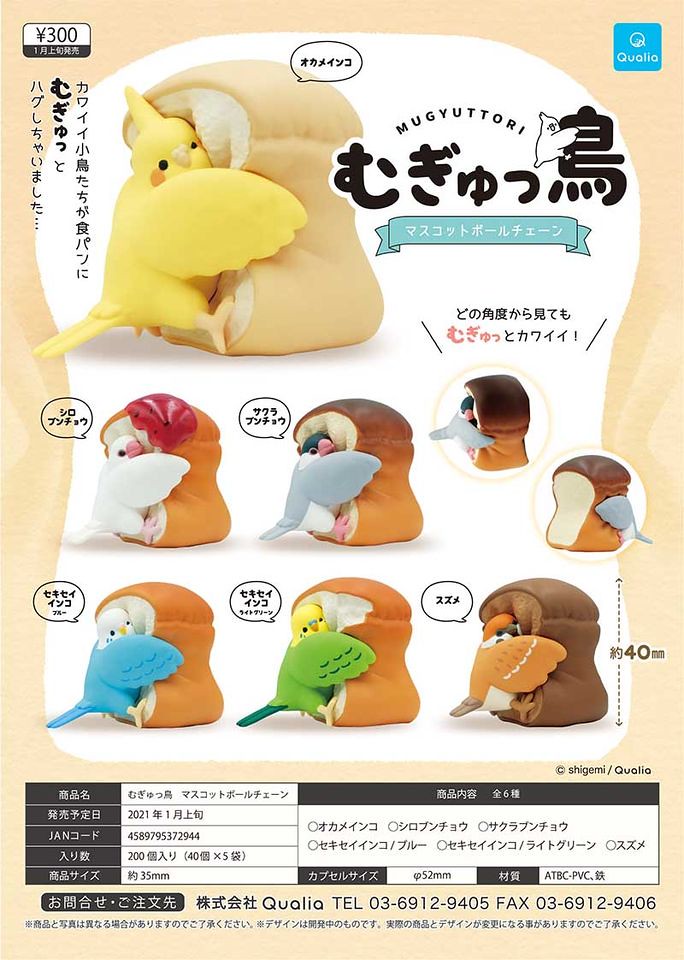 「抱緊處理的小鳥珠鍊吊飾」轉蛋,尺寸全高約 40 mm,收錄有:玄鳳鸚鵡、白文鳥、櫻文鳥、虎皮鸚鵡 (藍)、虎皮鸚鵡(綠) 、麻雀六種款式。除了緊緊抱著鬆軟吐司、整隻鳥都陷進去的超萌造型,在細節上也不馬虎,蓬鬆的吐司還有烤焦塗裝、草莓果醬、全麥吐司等不同的款式,相當有誠意的賣萌!鳥奴們不要錯過啦~