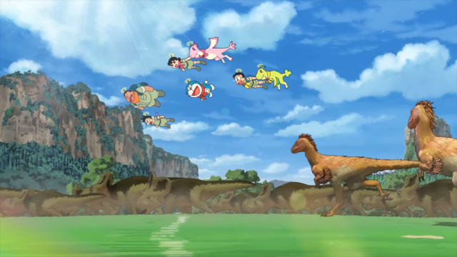 一開始最讓我感到視覺驚艷的是恐龍互相廝殺的臨場感,我不知道這是不是哆啦A夢大長篇中頭一遭出現如此逼真寫實的美術場面,但若是以過去《哆啦A夢:大雄的恐龍》(兩個版本)相比,利用3D效果多添加了震撼感與真實感,跟著哆啦A夢一行人的率領之下,真的有一種身歷其境的感受,我認為這是本片很值得讚賞的優點之一。