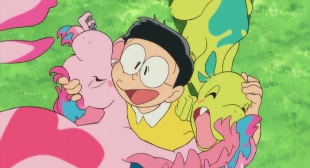 還有就是大雄那驚人的臂力確實是嚇到了我,那個程度就好像《數碼寶貝Tri.》中,素娜不論怎麼被撞擊都沒有事一樣的,明明在本作中也一直也時不時以大雄學不會吊單槓這件事來與體型弱小、學習飛行較慢的小Q相互陪襯,但在後面卻可以抓著翼手龍好長一段時間這件事,那個臂力幾乎可以跟隔壁能夠輕鬆捧起999.9KG寶可夢的智爺相比了吧XD
