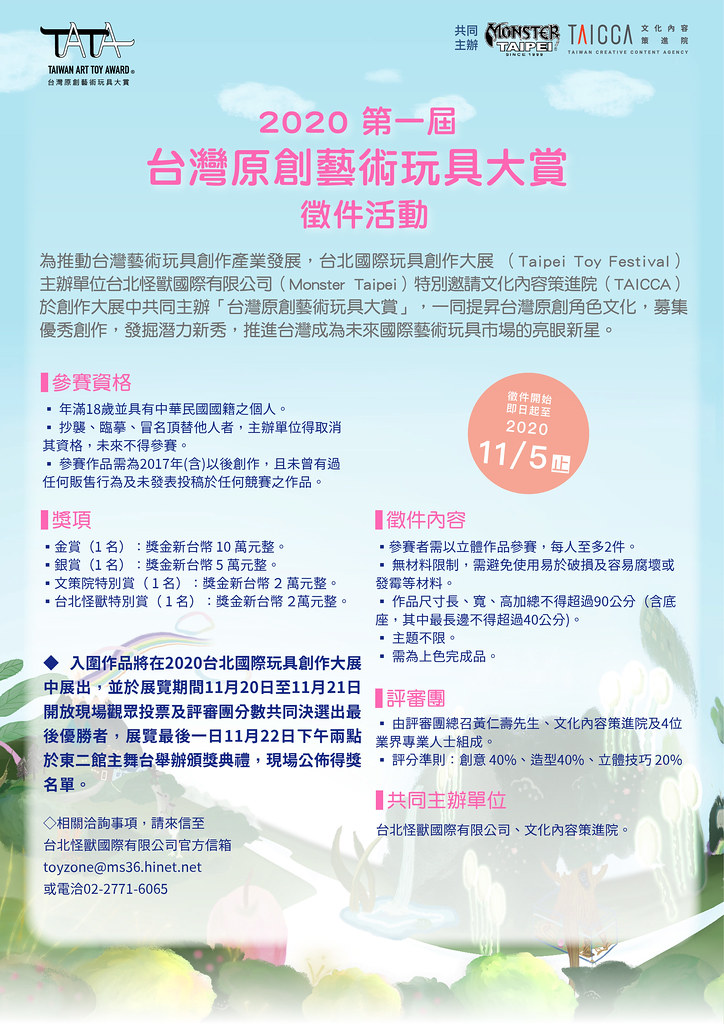 喜愛創作的玩具人看過來~為推動台灣藝術玩具創作產業發展,台北國際玩具創作大展 (Taipei Toy Festival)主辦單位台北怪獸國際有限公司(Monster Taipei)特別邀請文化內容策進院 (TAICCA) 於創作大展中共同主辦「第一屆 台灣原創藝術玩具大賞 Taiwan Art Toy Award」,一同提昇台灣原創角色文化,募集優秀創作,發掘潛力新秀,推進台灣成為未來國際藝術玩具市場的亮眼新星!