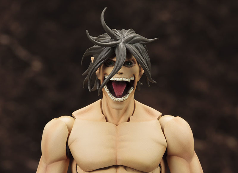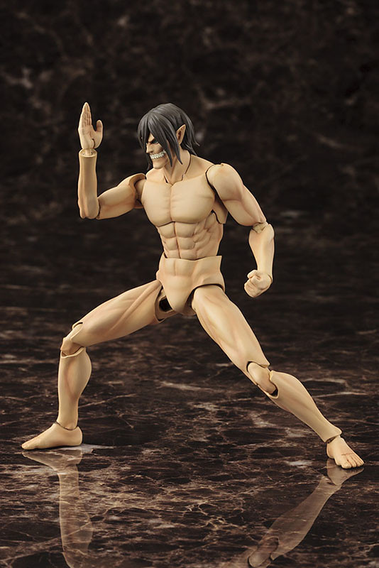 「艾連・葉卡 巨人Ver.組裝模型」,將艾連變身成巨人型態模樣立體化,全高約16公分。透過組裝模型還原艾連巨人化後的肉體造形,肌肉線條與全身多處可動關節搭配,重現劇中的戰鬥姿態等動作。另外除了有可以替換的正常臉與咆哮臉,頭內部還設計有可移動式的眼球,可以自由改變視線,營造不同的表情;頭部均有預塗了 PVC 塗裝,因此不會上色塗裝也沒問題!