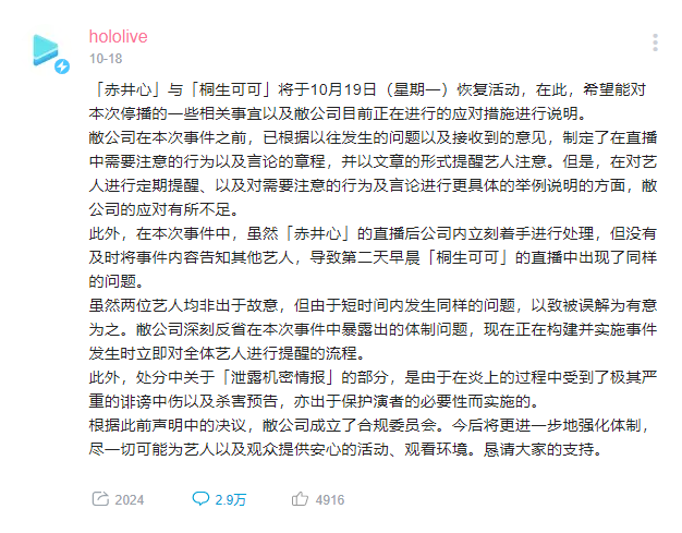 公告內容表示對於該VTuber遭到禁播處分時的惡意騷擾及不當誹謗,將不排除提告,不過由於在bilibili的公告內容與推特上有所差異,也招來了中國網友的不滿與嘲諷,對於HoloLive兩面都想討好的舉動嗤之以鼻。