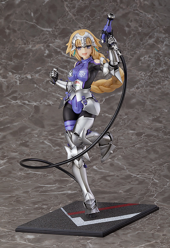 「貞德 RACING Ver. 1/7比例模型」依據近衛乙嗣老師的畫稿將身穿全新專用服裝的貞德立體化,造型細膩刻畫出鎧甲曲面與銳利邊緣,以及貞德豐滿的胸部、臀部曲線。施以銀白金屬色塗裝增添鎧甲的厚重質感,並印刷胸口的車隊標誌等細節,「輪型槍」、頭髮零件躍動的造型與貞德輕快的姿勢,讓作品更增添活力。底座部份則與前兩作相同,仿製細緻的賽車場柏油路面。