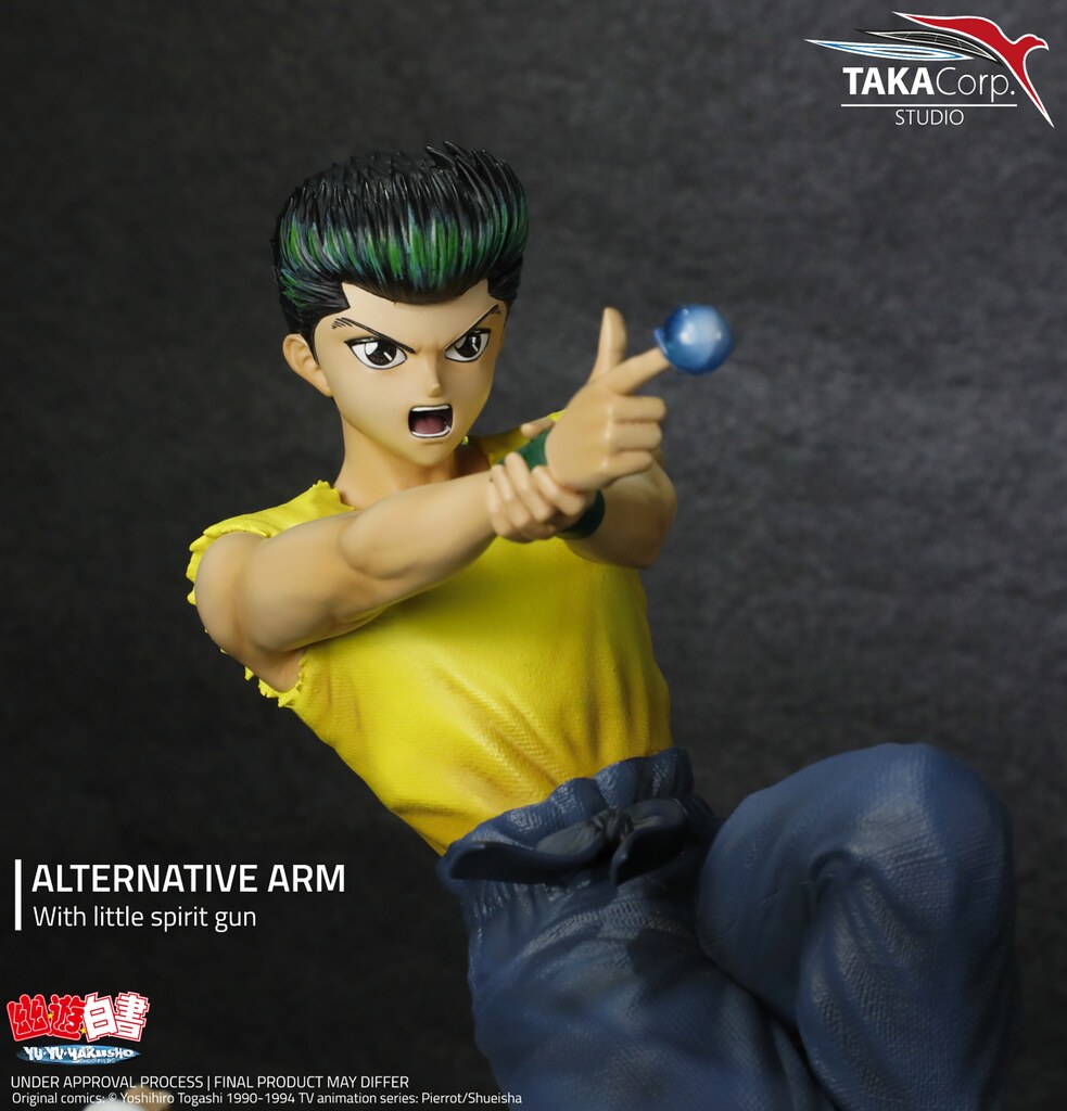 Taka Corp Studio推出的「幽助」1/6 比例雕像,尺寸約高30公分,以初期的服裝造型呈現發射靈丸的經典姿勢!臉部還原幽助在戰鬥時喊叫的表情,黃色背心、褲子等細節也精緻打造;從目前公開的作品看來,向後梳的招牌髮型並沒有在前額留下幾根散落的頭髮。因發射靈丸的強大衝擊力而身體向後仰,腳下的基石也破裂飛噴,並揚起了煙霧特效,展現出強烈的力道。手指尖的靈丸特效件以透明材質打造,再現劇中熱血的動作場面!