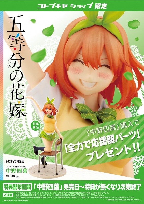 日本壽屋玩具公司(KOTOBUKIYA)在推出人氣戀愛喜劇《五等分的新娘》為主題的「中野三玖」、「中野一花」後,再度發表了中野一家五胞胎的新作:「中野四葉」1/8 比例 PVC塗裝完成品 ,參考售價為 11,000 日圓,預計 2021 年 01 月發售。