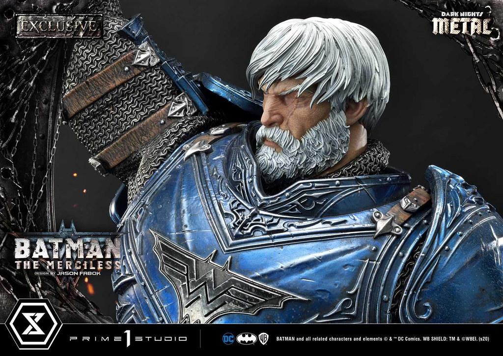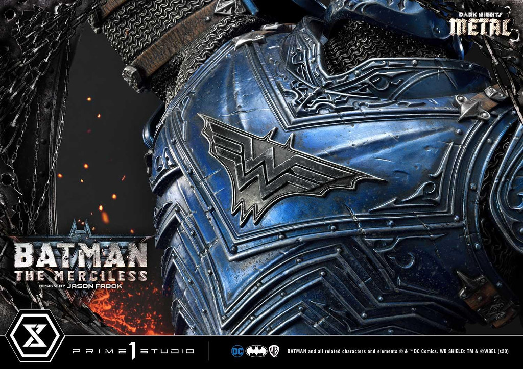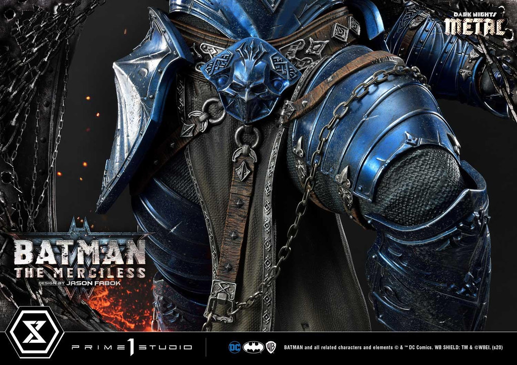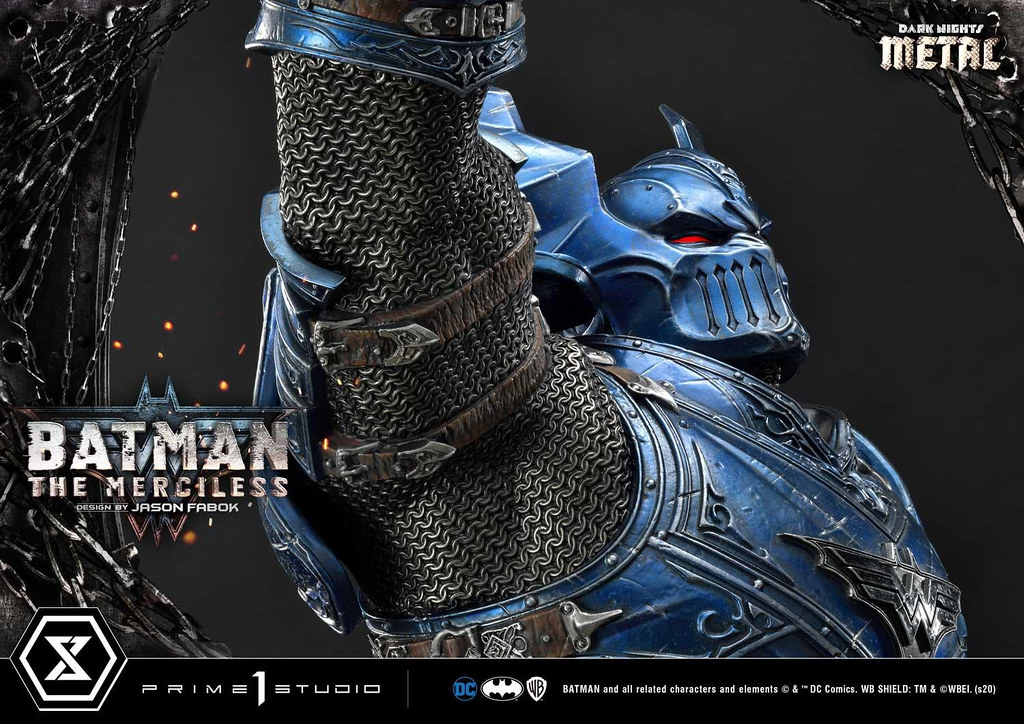 由於高舉殺神之劍「God Killer」的姿態,本作高度來到驚人的 111.9 公分,全身被重甲包覆的無情者展現出無人能擋的強悍魄力,藍色盔甲銳利的線條、立體雕紋,以及彷彿真的歷經多場戰役的舊化處理,加上內裡的鎖子甲、各處皮革綁帶,堆砌出豐沛的情報量,頭盔部分還有兩種造型可以替換,侵略性十足的 God Killer、無情者胸口位置的變體版蝙蝠標誌,真的太帥!!