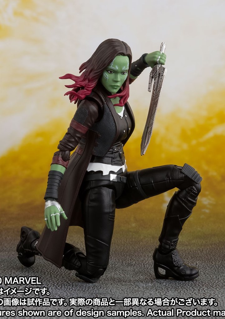 S.H.Figuarts 葛摩菈,尺寸全高約 15 公分,以電影《復仇者聯盟:無限之戰》中登場的造型為基礎,再現充滿細節的貼身皮衣與長版仿皮大衣;儘管是綠色皮膚,臉部精細地形塑出演員「柔伊·莎達娜」的輪廓,紅色頭髮施以漸層塗裝營造層次感,附有兩款替換表情與搭配動作替換用的頭髮零件,搭配雕紋細緻的銀色長劍,還原劇中的戰鬥姿態!