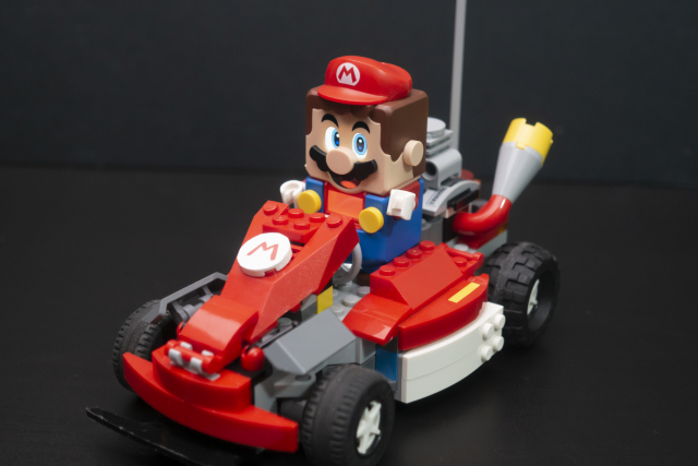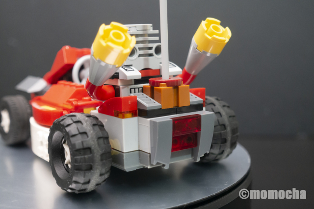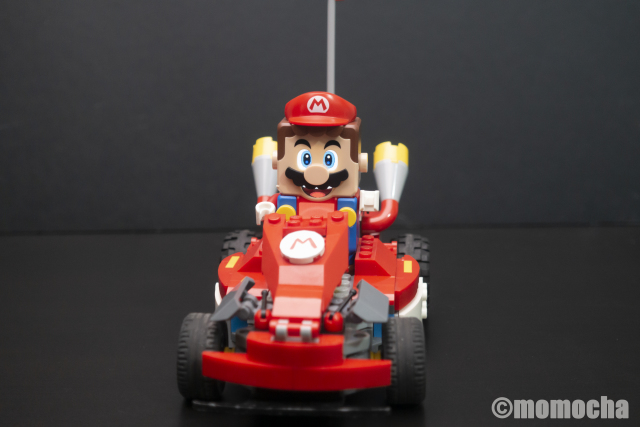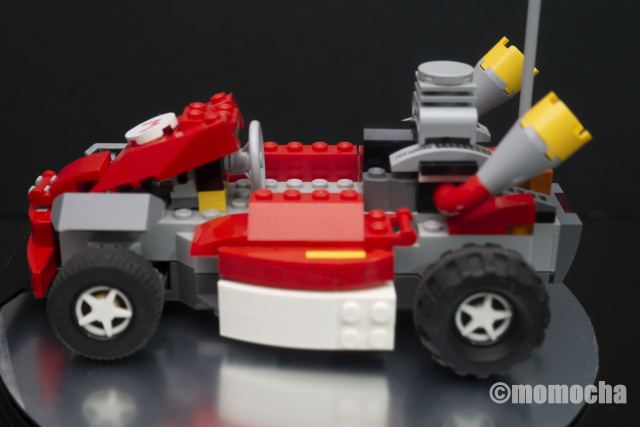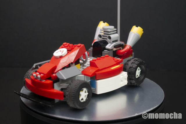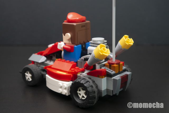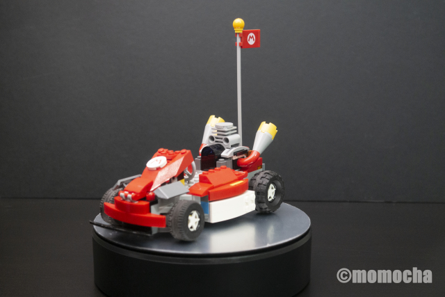 這個車身使用了紅色白色和黃色為主要顏色組裝出一個卡丁車的模樣,車尾上面還加了一個mario標誌的國旗