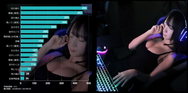 Bauhutte也對日本玩家們長時間玩遊戲會對身體上哪個部位產生不適感做了一個問卷調查,而最後得出的結果為「眼睛疲勞」第一名。而腰痛和脖子痛則是第二三名。這問卷的統計時間為 2018 年 4 月至 2019 年 5 月,總共有 971 票。可以看出來眼睛疲勞對很多玩家來說都是一件非常困擾的事情,但是這款『電競專用眼鏡』的抗藍光技術或許能夠幫助各位玩家改善這情況也說不定。