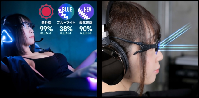 說到遊戲,面對著電腦螢幕的時間會變長。而據說LED螢幕的「藍光」性質接近紫外線,不僅會讓眼睛疲勞,還會讓身心都陷入疲勞之中。那麼既然都自稱是電競專用眼鏡了,那防藍光的措施肯定都做得非常完善,不僅能擋掉 99% 紫外線,還能擋掉 38% 的藍光和 90% 以上的酸化光線。雖然防藍光眼鏡以現在的技術來看是理所當然並且到處都有的,但是「電競專用眼鏡 BGG-01-BK」這款眼鏡是採用了沒有顏色的透明鏡片,不但跟外面賣的防藍光鏡片不同,又可以在不損害遊戲世界觀的色彩世界中進行遊戲,這才是真正的『電競專用眼鏡』吧。