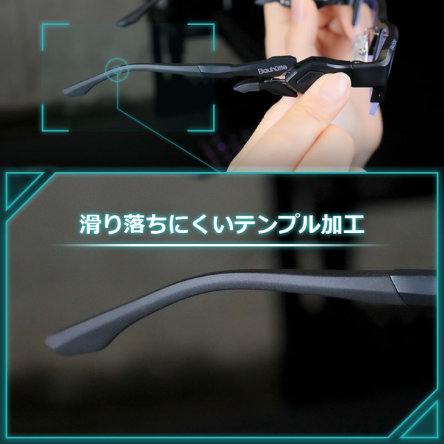 而各位戴著眼鏡的玩家們應該都非常清楚,戴著眼鏡並戴上耳罩式耳機的話,掛在耳朵上的框架壓著耳朵旁,讓那個部位非常不舒服,甚至會讓人感到疼痛。即使不戴耳機,只要長時間戴著眼鏡,框架太緊的話就會給耳朵帶來相當大的負擔。但是Bauhutte推出的『電競專用眼鏡』使用了可變化式框架,不僅不會給耳朵帶來負擔,也不用擔心眼鏡會掉下來,依舊可以戴著眼鏡沉浸於遊戲的世界之中。