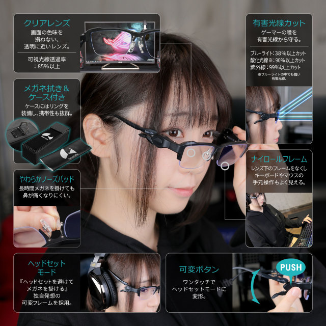 這款「電競專用眼鏡 BGG-01-BK」是採用半框鏡架,也就是鏡片的下方是全空的狀態,讓打遊戲時不會被多餘的框架擋住視線。而鼻墊的部分也是用軟墊材質,讓玩家戴久了不會產生不適感,也不會有鼻印殘留在鼻子上。而鏡腿的部分也採用了防滑材質,讓玩家玩遊戲太刺激而過於入迷時不會讓眼鏡滑落。眼鏡鏡片部分也可以向日本全國的知名眼鏡品牌「眼鏡市場」店鋪來做維修以及更換。