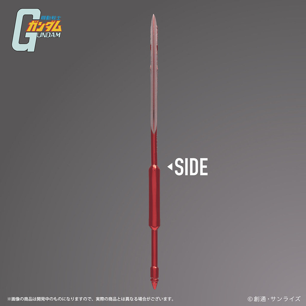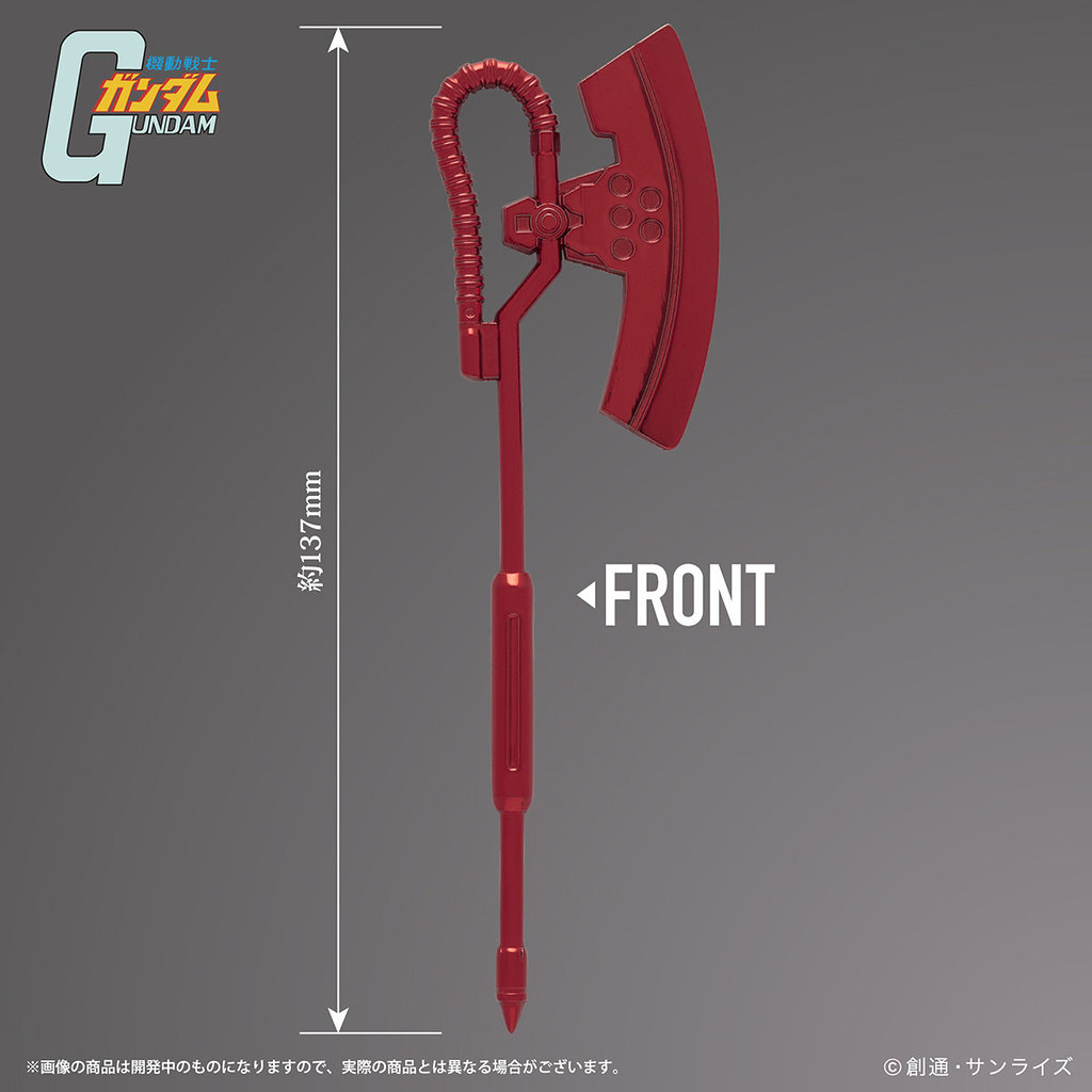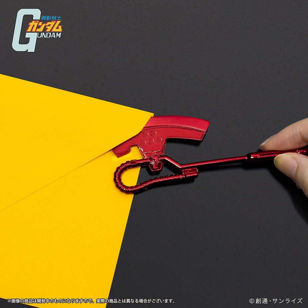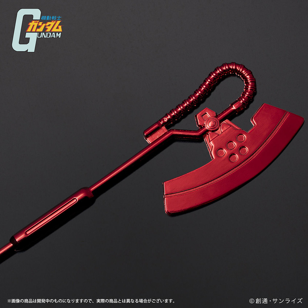 以《機動戰士鋼彈》中 ZAKU 薩克 MS-06的經典武裝-電熱斧(又稱熱能斧,ヒートホーク)作為原型設計的拆信刀,尺寸約為 36× 137 × 5 mm,使用鍍鋅合金製作,相當具有份量感,換上象徵夏亞的金屬紅色,打造出夏亞專用的印象,使用起來更有氣勢!參考售價為 3,300 日元,目前已於日本PREMIUM BANDAI 線上商店開放預購,預計將於 2021 年 2 月發貨。