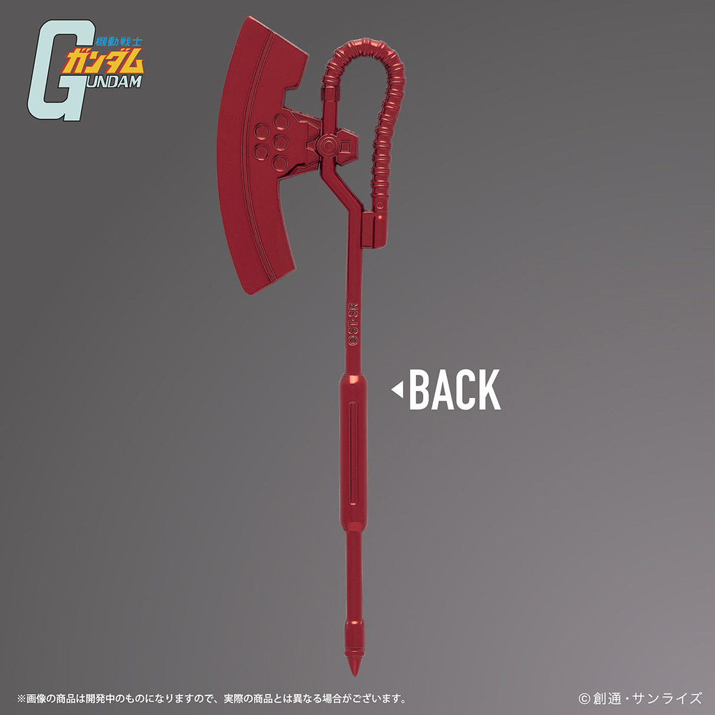薩克招牌的電熱斧,為吉翁初期 MS 採用的近戰格鬥實體武器,利用 MS 本身提供的電能加熱刀刃,足以一擊劈穿艦艇的艦橋或砲塔。此次化作小巧精緻的拆信刀,讓玩具人拆信也能展現霸氣!!!