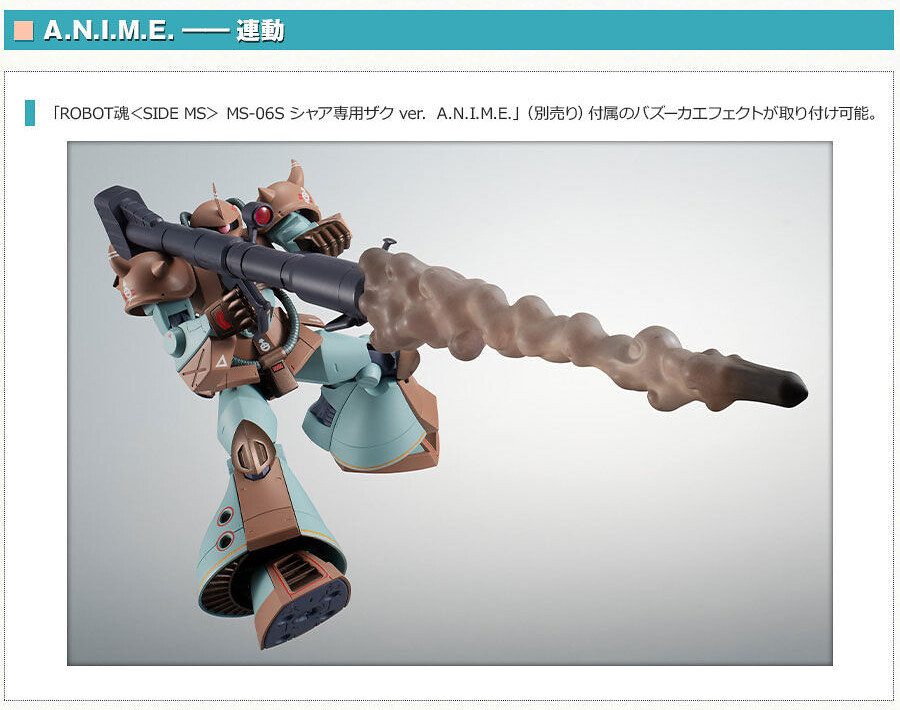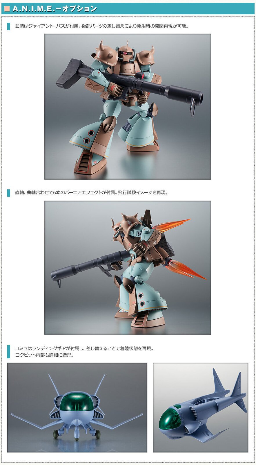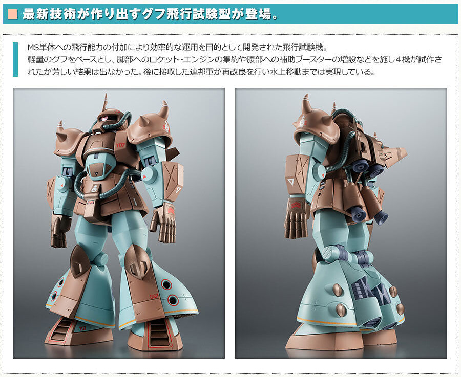「ROBOT魂 古夫飛行實驗型 ver. A.N.I.M.E.」再現背部、腿部特徵的數具熱核噴射引擎,以及腿部左右各兩門的 180mm 火箭炮發射口,除了本體外配件更收錄武裝「巨型火箭炮」、飛行時的「推進噴射特效」以及吉翁軍使用的「COMMU」連絡機,可再現伴隨古夫飛行實驗型進行測試任務的場景!