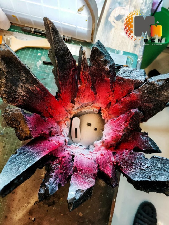 塗裝完成後發覺沒有一個配合他的地台感覺不出他實力的強大於是製作了一個爆石的光影地台以紅色內圈為基底 配合翅膀透出微微發亮感