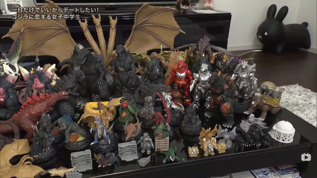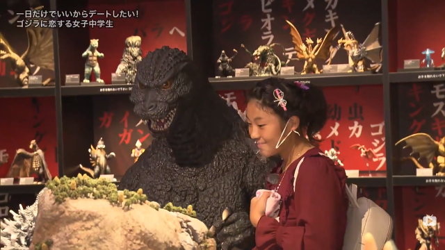 從節目當中,我們不僅從擺滿房間的多隻哥吉拉玩具中看見了這名少女的熱愛,甚至更語出驚人地說出想跟哥吉拉約會、Kiss、想被推倒…等熱戀中的少女會說出口的話,可以感受到這名女孩對怪獸之王的瘋狂與熱烈的愛。