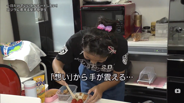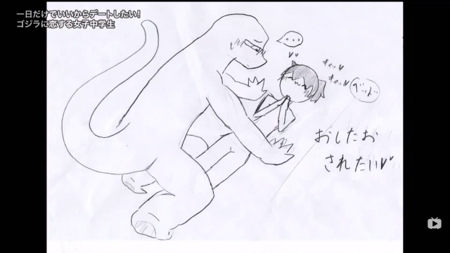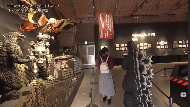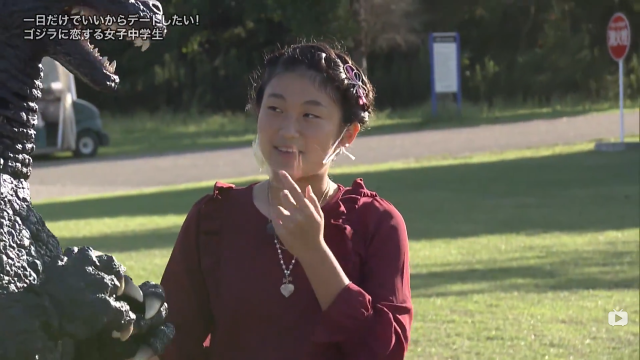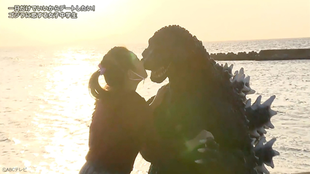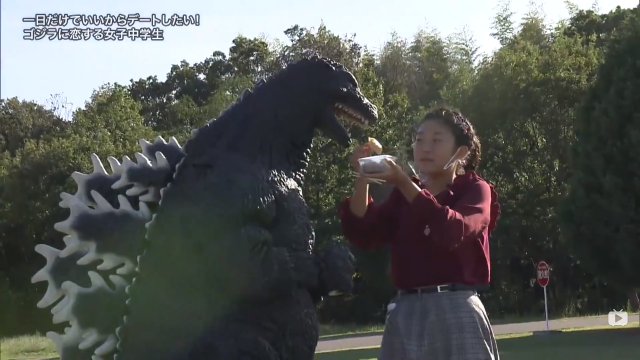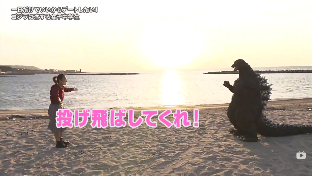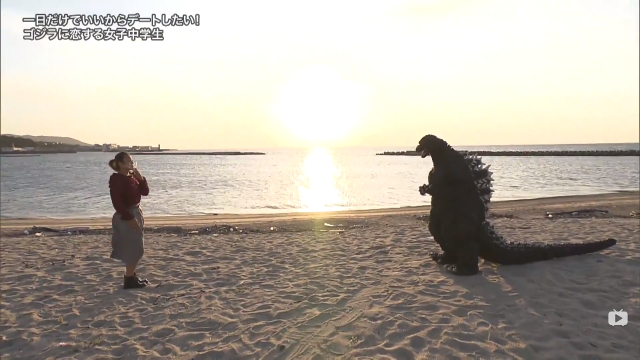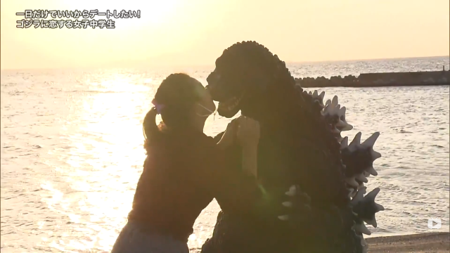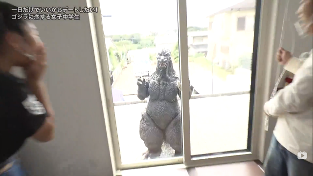 因此,《探偵ナイトスクープ》真的特別邀請到了哥吉拉本尊到現場,與這名「哥吉拉夢女」來一場一日約會,儘管哥吉拉突如其來的拜訪,讓這名國中少女措手不及,但為了在這一天留下此生難以忘懷的回憶,少女更是精心準備便當與打扮,好好地與怪獸之王來場羅曼蒂克的約會~