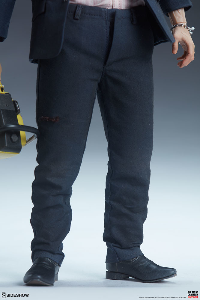 除了經典的電鋸之外,其餘配件還包含錘子、鹿角手柄刀,以及多個替換手型,值得一提的是,西裝褲的右大腿部分,是採用劇中皮臉被工具砸中跌到、電鋸割破褲子傷到自己的樣貌製作。