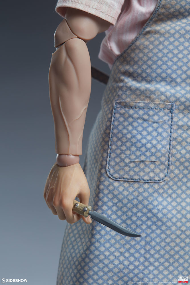 在《德州電鋸殺人狂》末段、皮臉讓女主角「莎莉」逃走,憤而在路上狂舞。一個戴著人臉面具的巨漢、不協調且奮力地揮舞電鋸,搭配上當時的橘紅夕陽,讓這段「Chainsaw Dance」成為本片除了血腥場面之外的另一經典!本作還原了皮臉身穿西裝的造型,如果再更胖一點就完美~除了所謂的 “Pretty Woman” 面具頭雕之外,還有一個 “Old Lady” 面具造型的頭雕可以替換,加上可穿脫的西裝外套和那件舊舊的髒圍裙,就能展現劇中的另一讓人毛骨悚然的樣貌。