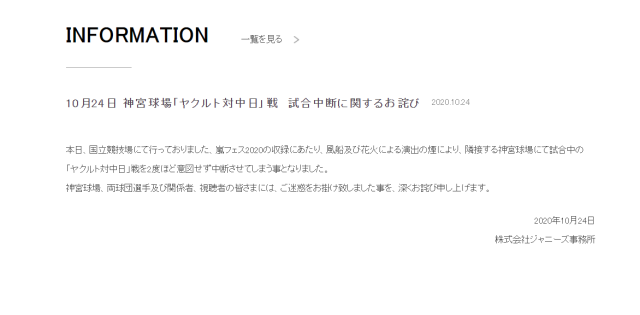 也因此在事發當天,傑尼斯事務所特別在官方網站上發佈了一則針對明治神宮棒球賽的道歉聲明,表示對於煙火所帶來的燈光與煙霧造成二次干擾賽事,以及給觀賞球賽的觀眾不便,對此傑尼斯事務所感到相當抱歉。