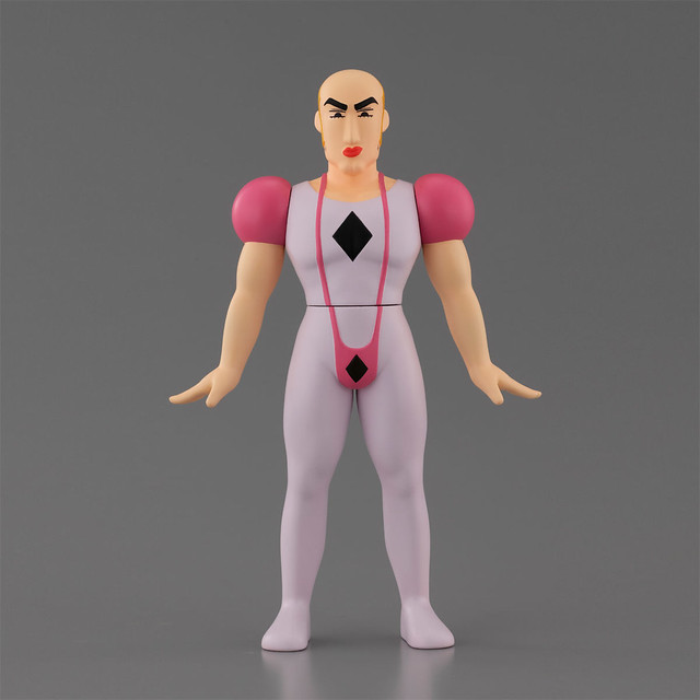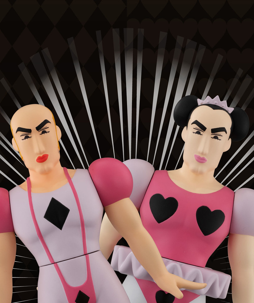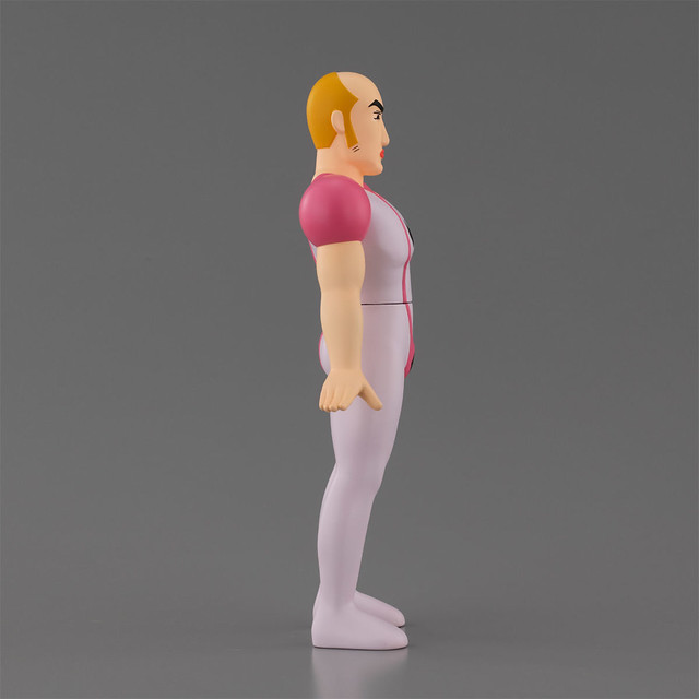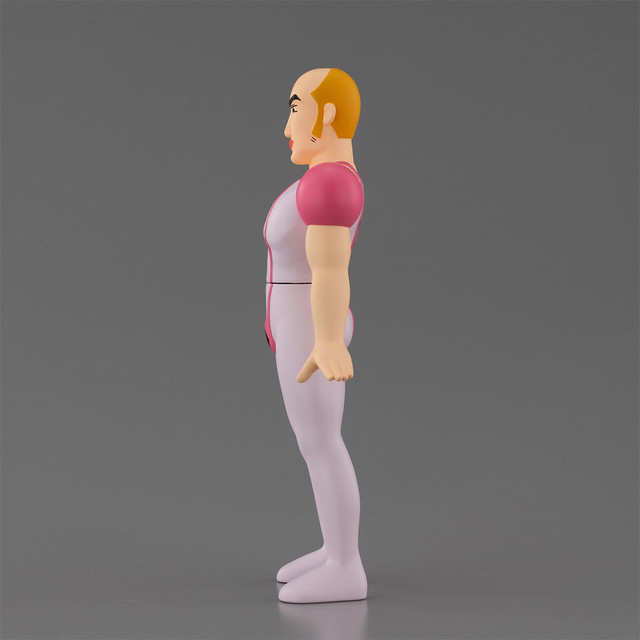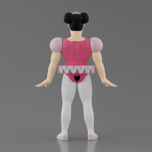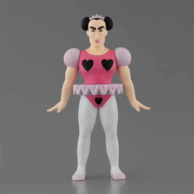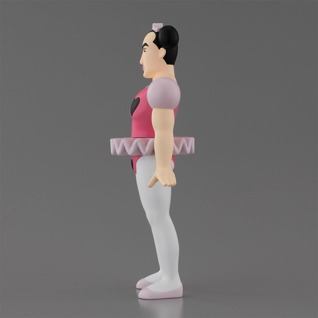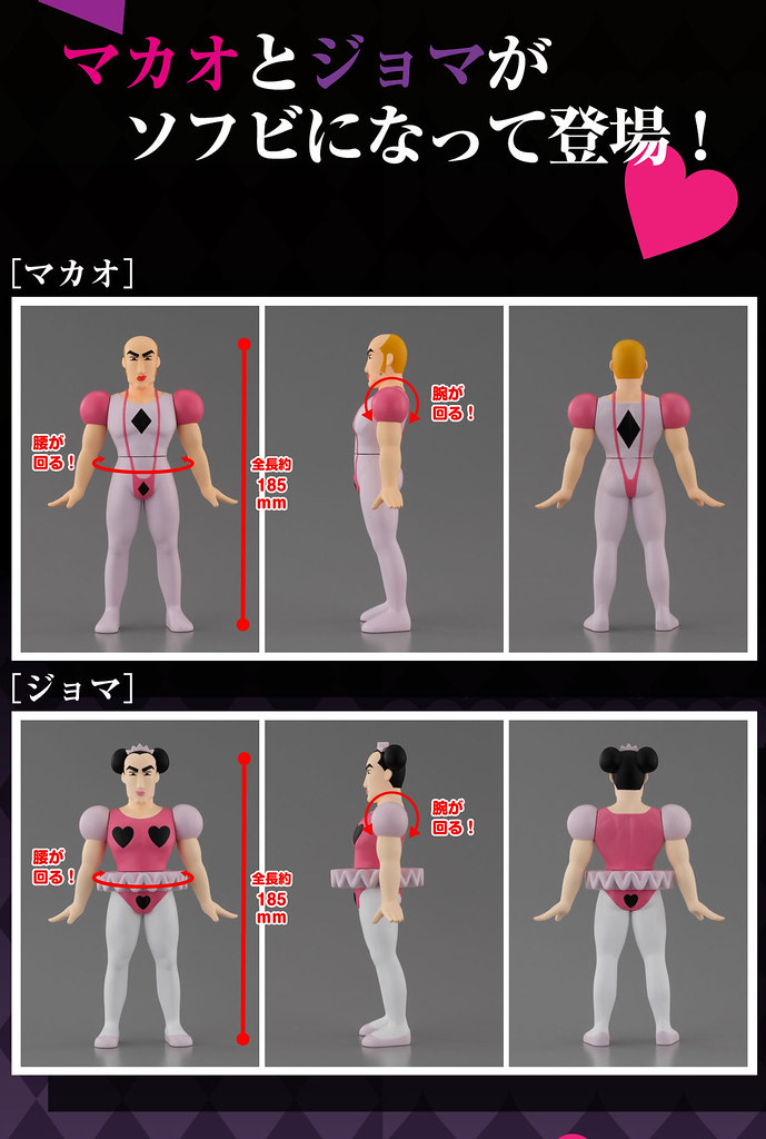 《蠟筆小新:搞怪遊樂園大冒險》第二彈商品「馬卡歐&裘馬」PVC 可動軟膠,尺寸高約 185mm,以劇中主要反派角色同性戀雙魔奇特的造型為設計,將光頭卻留有鬢角的馬卡歐與米老鼠包包頭的裘馬立體化!除了生動的表情,身穿的芭蕾舞衣也如實還原,包含胸前和下面的黑色愛心、黑色方塊圖樣與澎澎裙、澎澎袖等,在腰部與手臂有簡單的可動。