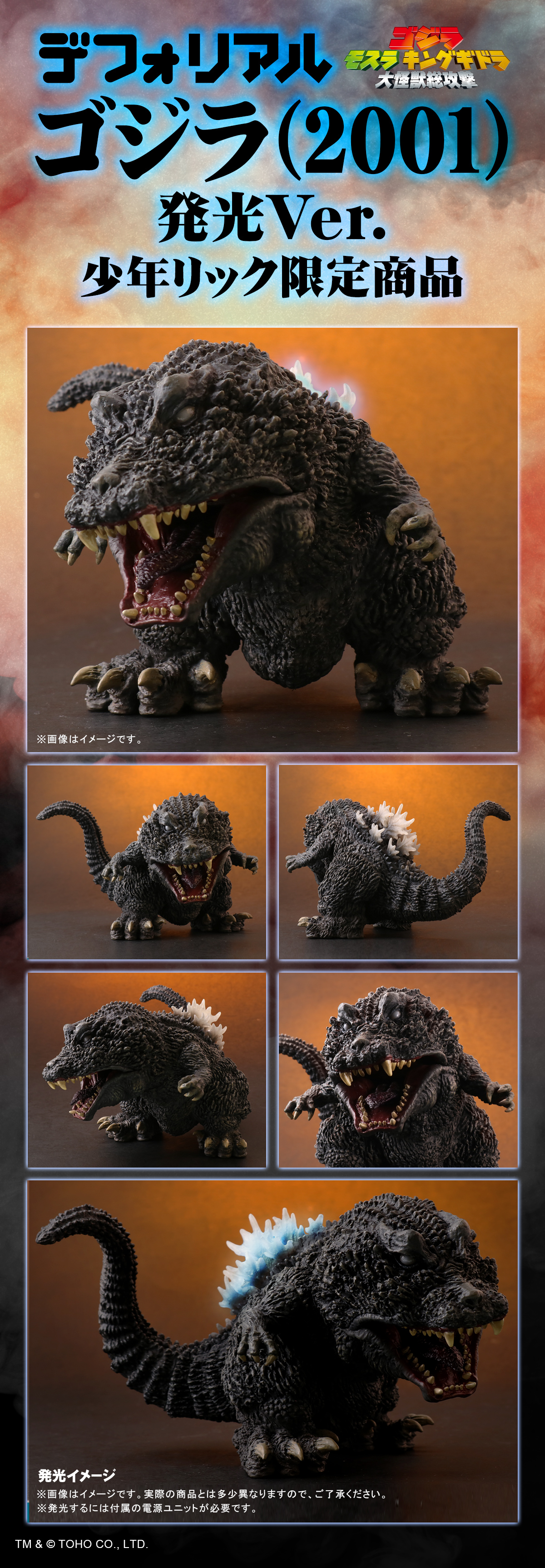 日本 X-PLUS 公司(株式会社エクスプラス)的超人氣精緻 Q 版比例模型 DefoReal 系列,繼以 2001 年的怪獸電影《哥吉拉·摩斯拉·王者基多拉 大怪獸總攻擊》為主題的「哥吉拉(2001)」後,再度推出新作「哥吉拉(2001)發光Ver.」少年RIC 商店限定版,參考售價為 8,250 日圓,預計於 2021 年 04 月發售。