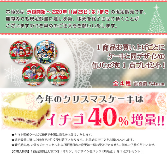 專門製作動漫ACG各作品日版官方授權的正版數位印刷甜點的品牌 priroll,將於聖誕節檔期製作《新世紀福音戰士》的 2020 年聖誕節蛋糕,將有四個圖樣可供選擇,推出草莓奶油口味,更有兩個蛋糕體 ( 發泡奶油 / 巧克力奶油 ) 搭配。訂購售價為 5,109 日圓,即日起開始預購。