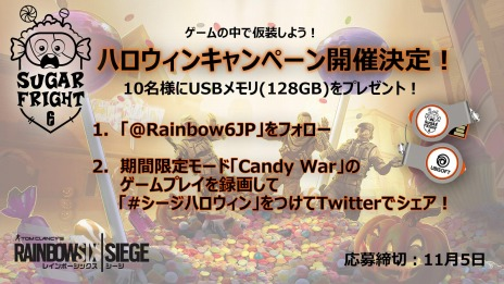 而日本的《虹彩六號》官方推特也發出了限時活動,只要在 11 月 5 日前關注(@Rainbow6JP)這個帳號並截圖在「糖果恐懼」中遊玩的畫面且上傳至推特hashtag「#シージハロウィン」就有機會獲得 128 GB的USB隨身碟。