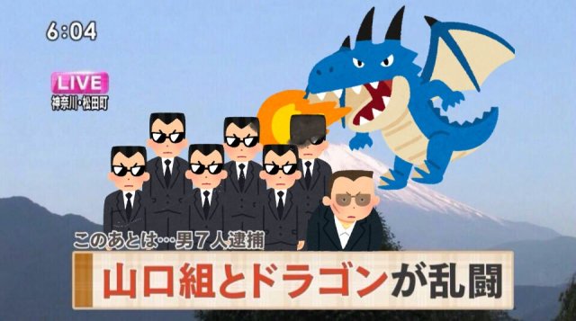 略懂日文的各位應該看得懂標題是「山口組與龍大亂鬥 其後七人遭逮捕 ! 」,哪呢 ? 山口組是日本的幫派組織中規模最大的指定暴力團。日本政府雖容許該組織合法註冊,但仍然依《暴力團對策法》將其列名指定嚴管。但是跟「龍」 大亂鬥 ! ? 這到底是什麼奇妙的新聞,連遊戲《人中之龍》都無法有這種事情發生啊XD。也引起日本網友開始製作梗圖,一嘲這則新聞。