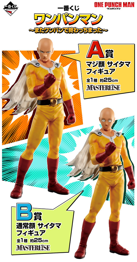 以擁有極高造型力的「MASTERLISE」 系列為A賞「埼玉 認真臉」、B賞「埼玉通常顔」,兩款尺寸全高25公分的角色模型,充滿魄力與滿滿肌肉!(下面好像也很大一包?!)