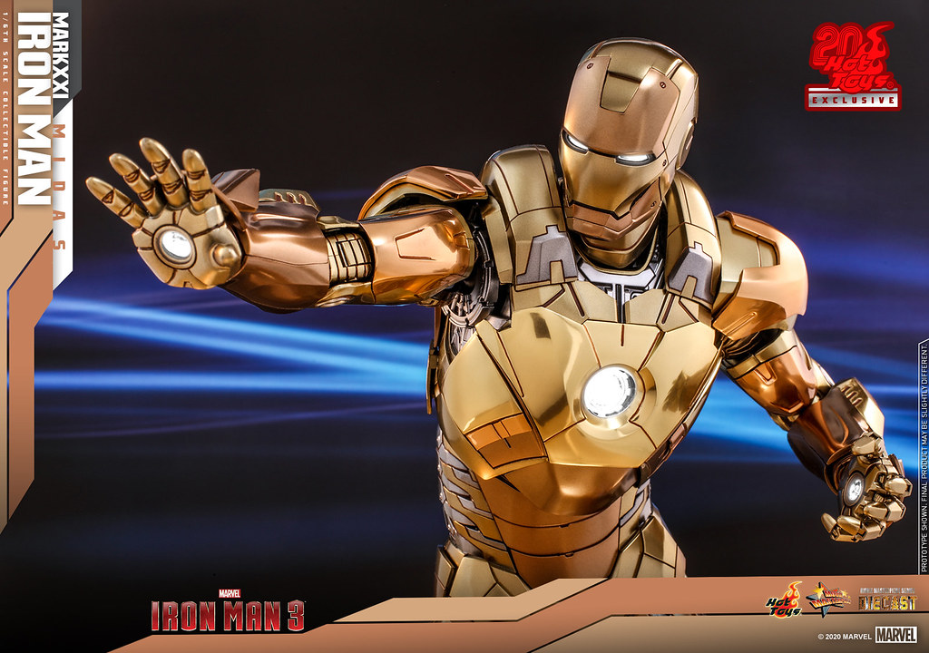 於 2020 邁入二十週年的 Hot Toys 將在 2020 年 11 月 4 日~2021 年 3 月 31 日這段期間於銅鑼灣商場「Fashion Walk」開設「HT20THPlus」店鋪,將會不定期更新展示主題並提供旗下商品預訂、販售服務......等;本次以合金(Diecast)為主要材料打造的「鋼鐵人馬克21(麥達斯)」高約 32.5 公分,全身共計 30 處可動,最大亮點即為經過電鍍處理與金屬感上色交織而成的華麗視覺效果,在兼具銳利金屬質地的同時展現鋼鐵裝的細節與層次!