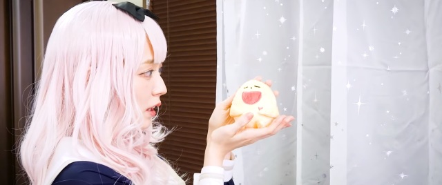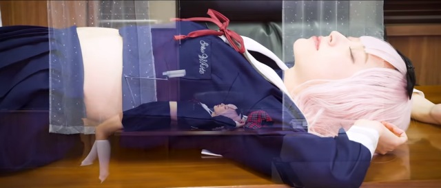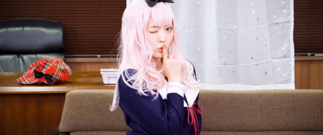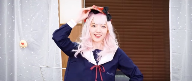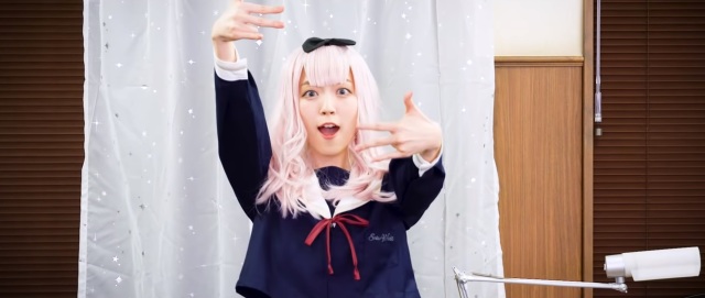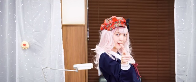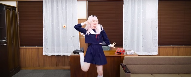 這次在「書記舞」中,穿上學生服與白色長襪,戴上粉紅色假髮與千花標誌的蝴蝶結,在學生會會長的桌子前,模仿藤原千花可愛的舞蹈。配上原作聲優小原好美的歌聲,不難讓人融化都難啊 XD ( 小編被迷倒了~ )。