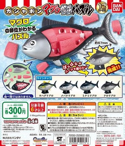 日本 Bandai 萬代玩具公司旗下的轉蛋事業部 GASHAPON 將大人氣的鮪魚解體拼圖轉蛋化,推出「GASHAPON 鮪魚解體拼圖」,共有四種款式,一轉參考售價 300 日圓,預計將於 2020 年 11 月登場!