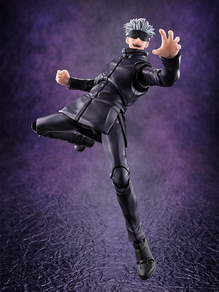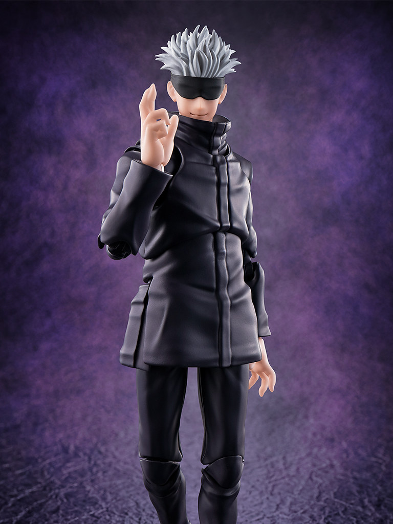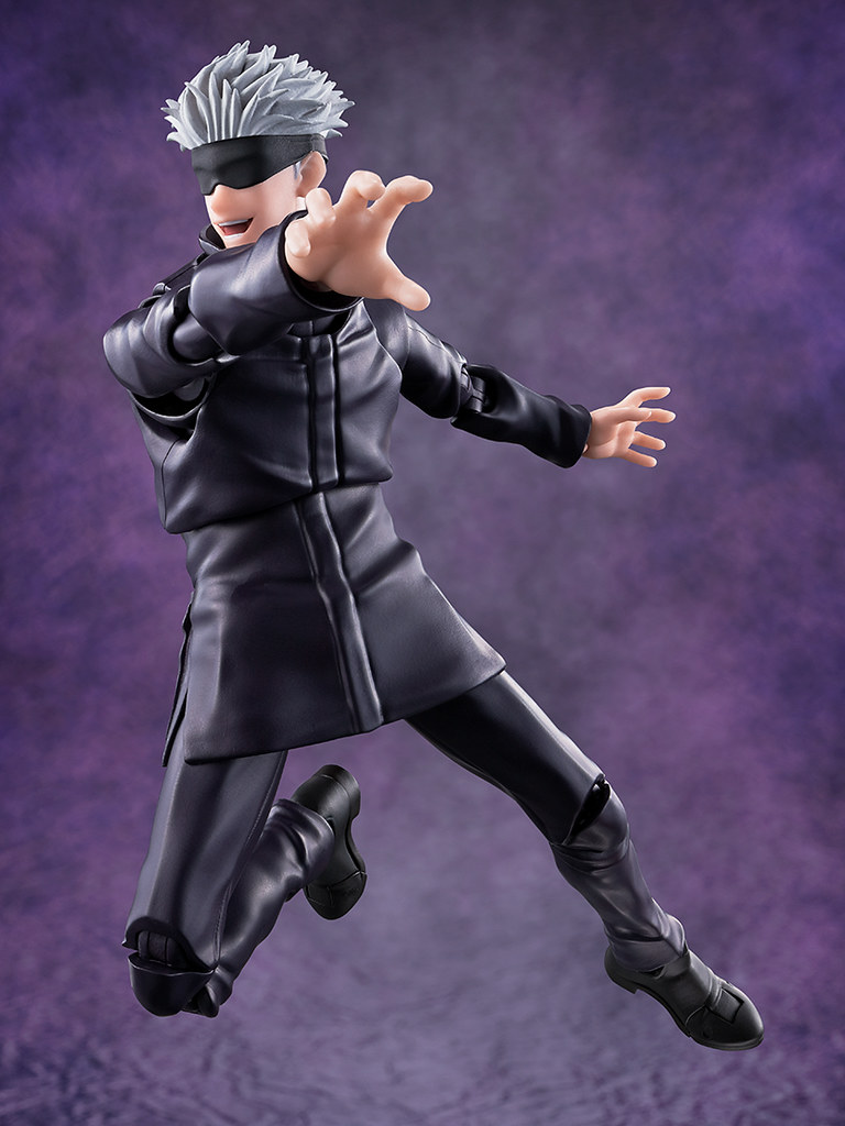 S.H.Figuarts 五條悟,尺寸高約180mm,再現五條老師高䠷修長的身材與一頭銀白髮、戴著眼罩遮住眼睛的特色造型。附有一派輕鬆的「微笑臉」和戰鬥時也得心應手、從容自在的「張嘴臉」兩款可替換的臉部表情,透過 S.H.Figuarts 出色的可動設計與替換手勢等零件,即使在一身包緊緊的黑衣下,也能賞玩出劇中各種精彩的動作與場景!