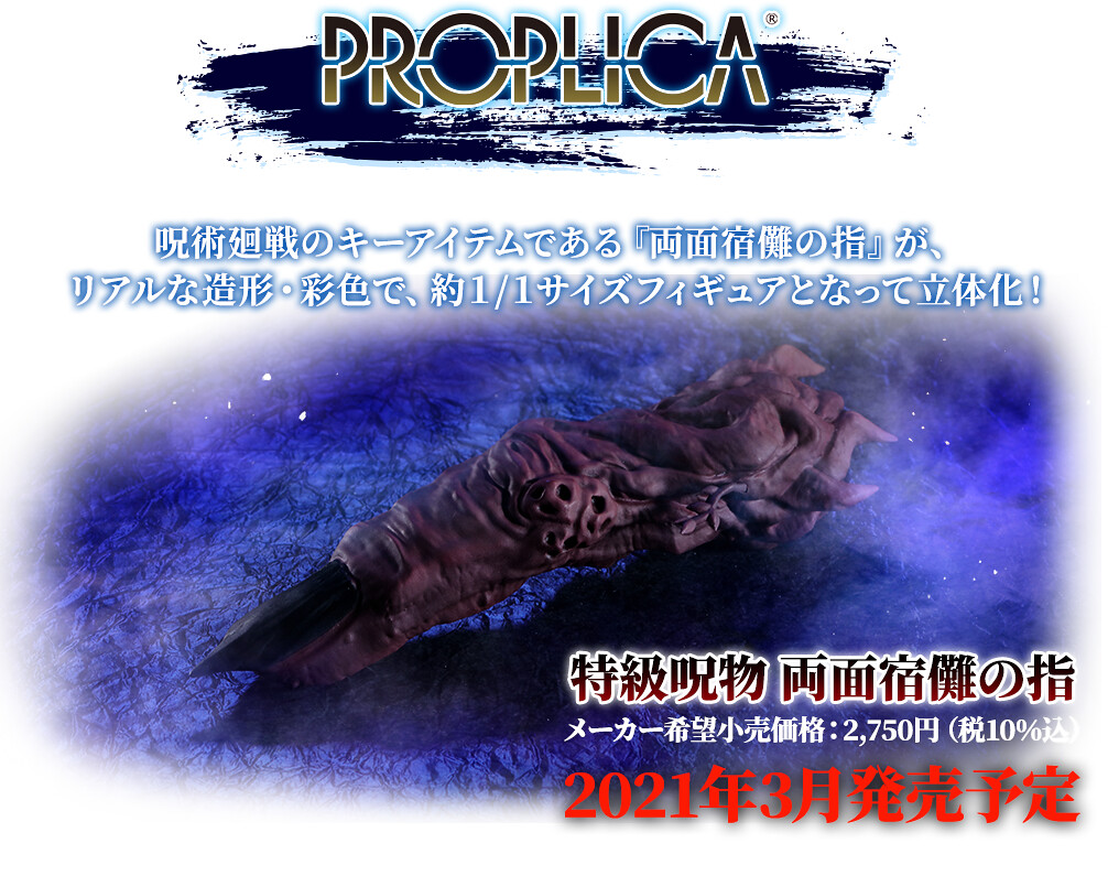 日本BANDAI SPIRITS 公司收藏玩具事業部「TAMASHII NATIONS」發行,匯集 最新技術將劇中道具真實再現的「PROPLICA」系列,將以新番人氣動畫作品《咒術迴戰》為主題,推出「PROPLICA 特級咒物 兩面宿儺的手指」,以劇中 1/1 比例尺寸呈現,參考售價為 2,750 日圓,預計將於 2021 年 03 月發售。