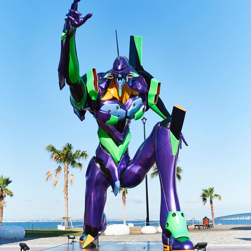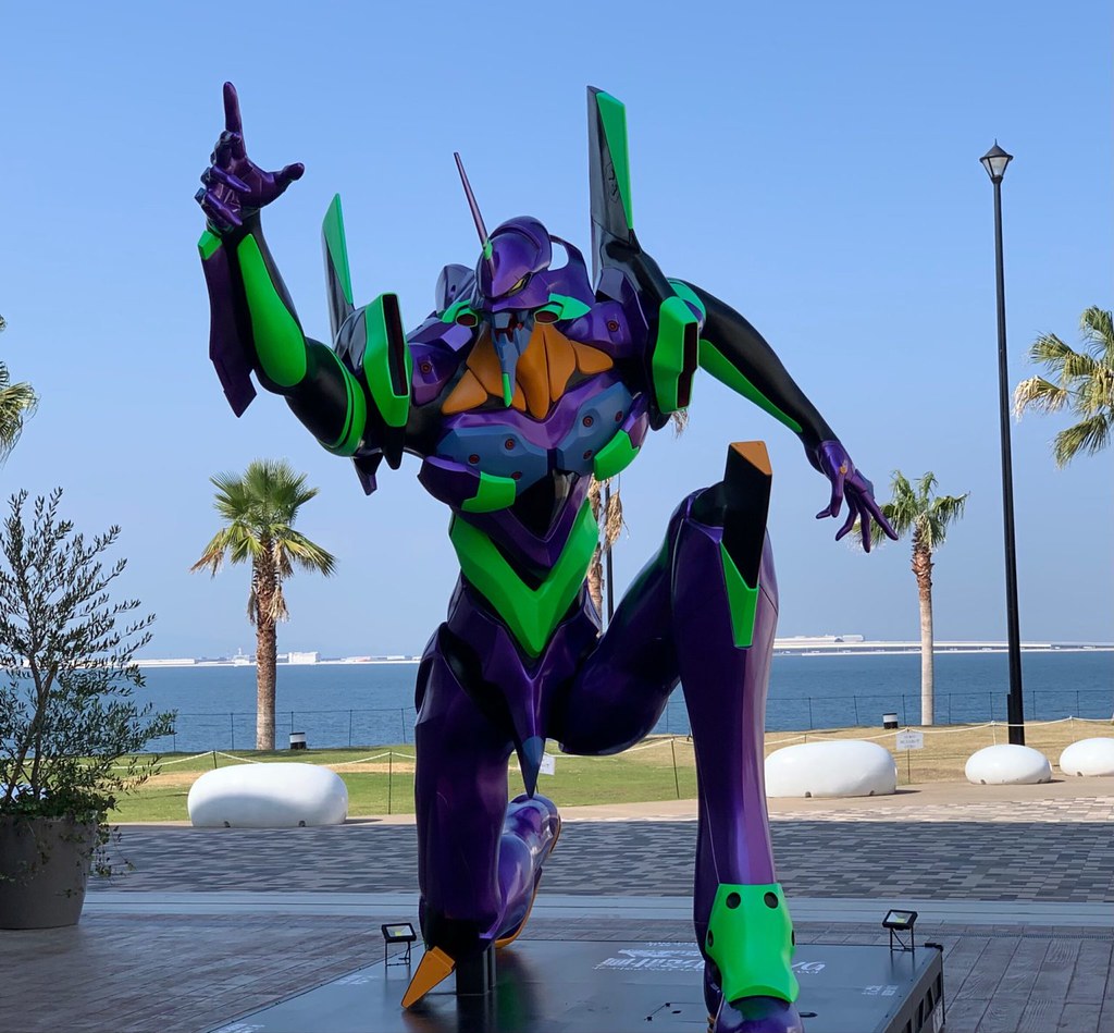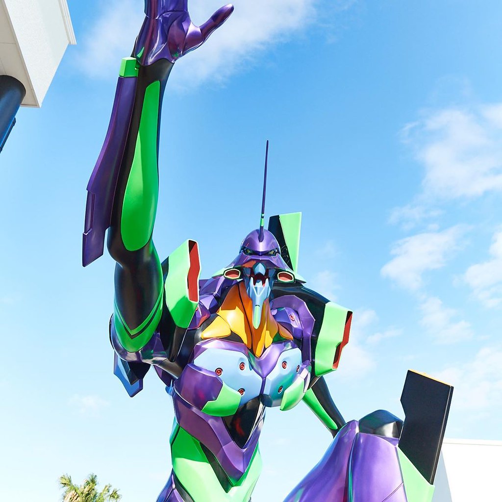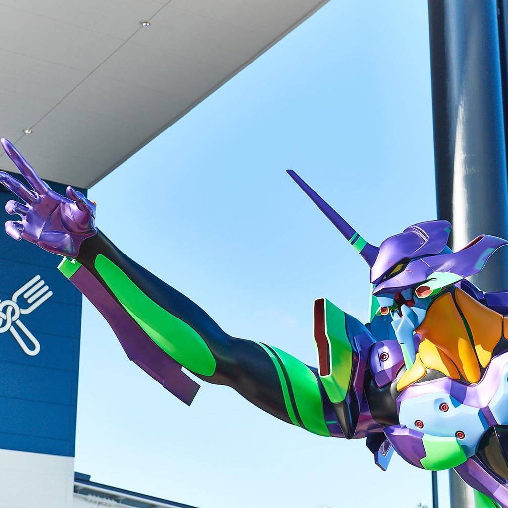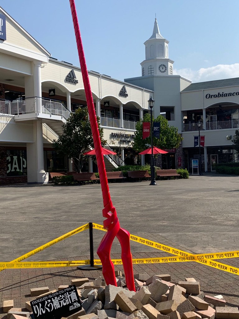 這次 3 公尺高的初號機與 3 公尺高的朗基努斯之槍來到關西,讓粉絲前往朝聖打卡~初號機充滿動態感的拋射姿態,俯瞰大阪灣的海邊區域!另外臨空城Rinku Premium Outlets的廣播語音也是由明日香、美里的聲優錄製,勸敗遊客們,要大家盡情購物~