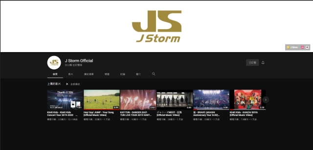 終於,傑尼斯唱片公司J Storm於日前11月1日時,首度開啟了YouTube官方頻道「J Storm Official」,並上傳了幾支Music Video跟Live Video,包含在今年Hey! Say! JUMP在9月時推出的新曲〈Your Song〉、KinKi Kids於6月發行的〈KANZAI BOYA〉。