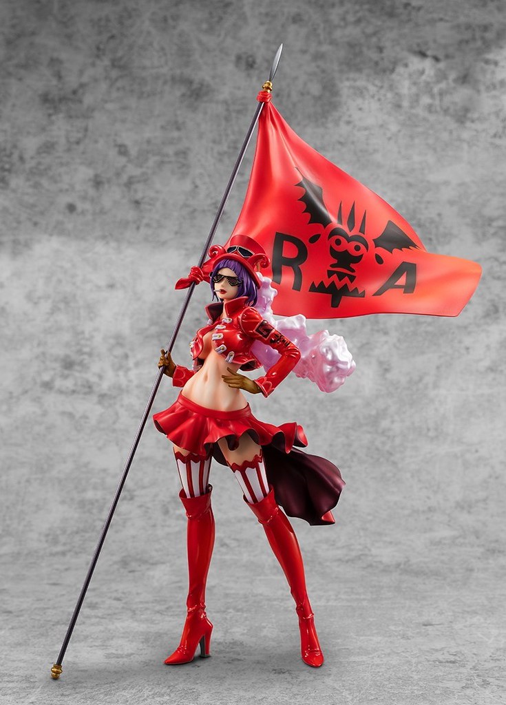 「P.O.P LIMITED EDITION 革命軍“東軍”軍隊長 貝洛·蓓媞」塗裝完成品,角色尺寸全高約255mm,手中的大旗更是高達 380 mm,還原貝洛·蓓媞特色的造型,一身鮮紅明亮的紅高帽、紅衣紅裙和紅長靴;嘴上叼著菸,脖子上繫著領帶、敞胸露乳的大膽風格,露出迷人的腰線和結實的腹部肌肉線條,身後的腰窩更是性感無比!拿著墨鏡露出笑容的模樣相當具有魅力,透過替換表情與手部零件,還可以呈現戴好墨鏡,手插在腰間的帥氣造型!